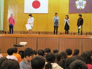 11月26日朝、体育館にて全校集会が行われました。今回は、生活安全委員会と保健委員会の発表がありました。