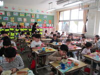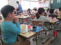 6年生の給食当番が、手際よく素早く配膳し手くれ、みんなおいしそうに食べていました。