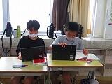 6年生です。一人一台端末を使って、テーマに沿って調べグループでまとめて発表する準備をしていました。