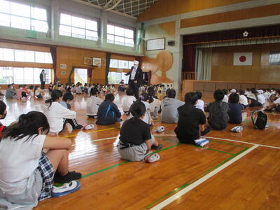 5月20日(金)に不審者対応についての学習を全学年で行いました。延岡警察署スクールサポーターの黒田さんが、「いかのおすし」の確認や「知らない人から、こんな声をかけられたらどうする?」を6年生代表児童と実演をしてくださったりしました。