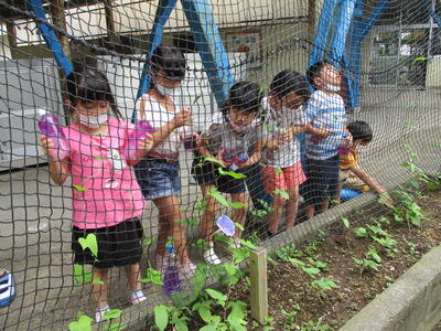 1年生が、アサガオの花で色水をつくっていました。毎朝水やりをして大切に育てて咲かせた花です。きれいな色水を見てとてもうれしそうな1年生でした。