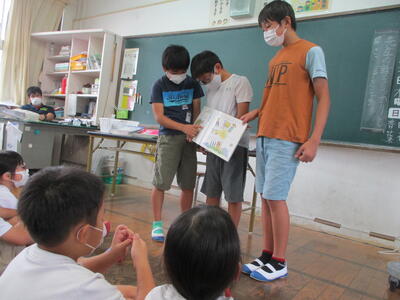 1学期は、先生たちによる読み聞かせでしたが、今回は5・6年生が下級生たちに読み聞かせをしました。短い練習時間でしたが、日頃の音読学習の成果を披露し、互いに息も合わせながら上手に読み聞かせができました。下級生は、上級生の読み聞かせにじっと聞き入っていました。
