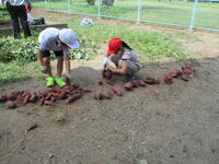2年生が芋掘りをしました。6月、体育館裏の学習園に植えたサツマイモの蔓が学習園の外にまでのびていました。