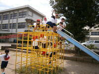 1年生の体育の時間は、並び方の練習をした後に、学校の遊具の使い方を学び、遊具であそんでみました。元気いっぱいに遊ぶ1年生は、とっても楽しそうでした。でも、集合の合図があると素早く集まることができる、メリハリのある子ども達です。