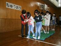 1年生のマット運動の様子です。まずは、回るなどの技ではなく、アザラシやゆりかごなどの運動で、マットに手をしっかりつけ体を支えたり、あごを引いて体を丸めたるする遊びをしながら体をほぐしていきます。マット運動に入る前の大切な学習です。