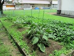 2年生の野菜畑の「オクラ」や「ナス」、あすなろ学級の「キュウリ」「枝豆」「スイカ」なども、実を付けています。