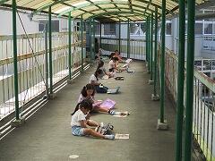 今日は、渡り廊下に出て、間隔を取って、初めて音を出しての鍵盤ハーモニカの練習をしました。