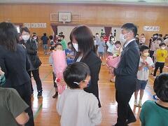 先生方の紹介、先生方からのお言葉、花束贈呈が行われ、最後は、子どもたちの間を通って退場としました。