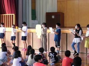 10月12日(火)の朝の時間に全校集会を行いました。10月の月目標が「本をたくさん読もう」ということで、今回は図書委員会に発表してもらいました。全校のみなさんが本をたくさん読んでくれるように、「読書の木」と「読書ビンゴ」の取組について説明してくれました。