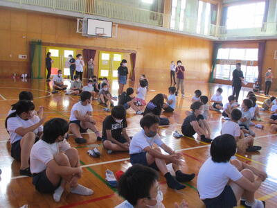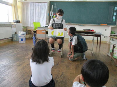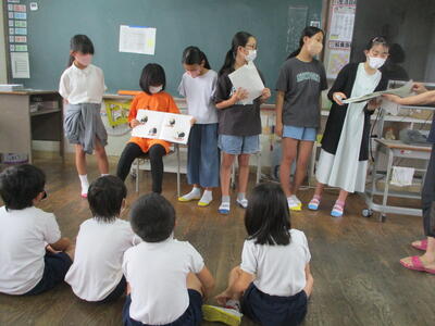 1学期は、先生たちによる読み聞かせでしたが、今回は5・6年生が下級生たちに読み聞かせをしました。短い練習時間でしたが、日頃の音読学習の成果を披露し、互いに息も合わせながら上手に読み聞かせができました。下級生は、上級生の読み聞かせにじっと聞き入っていました。