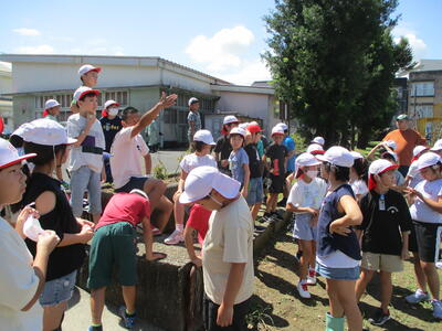 運動場に出た2年生と5年生が、思わずふれあう場面も。