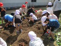 2年生が芋掘りをしました。6月、体育館裏の学習園に植えたサツマイモの蔓が学習園の外にまでのびていました。