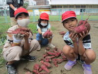 軍手をつけた2年生がおそるおそる土を掘ると、中から赤いサツマイモが次々と顔を出しました。