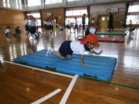 1年生のマット運動の様子です。まずは、回るなどの技ではなく、アザラシやゆりかごなどの運動で、マットに手をしっかりつけ体を支えたり、あごを引いて体を丸めたるする遊びをしながら体をほぐしていきます。マット運動に入る前の大切な学習です。
