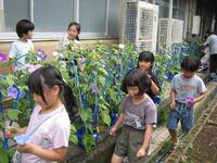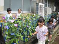 6月26日(木)1時間目に1年生が生活科の学習で「あさがお」の観察を行いました。葉がしげり、茎も伸び、花がどんどん咲いています。1年生が心を込めて毎日水やりをしてきた成果が現れています。今日は、花や葉をじっくりと観察していました。これからの成長も楽しみです。