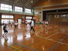 今回の授業のねらいや授業構成を説明していただいた後、実際にミニハードルや組み立てハードルを使って、実践練習を行いました。