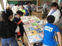 7月14日。選書会が始まりました。子どもたちに選んだ本を参考に購入計画を立てています。この日は、1年生が本を選びました。