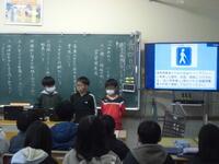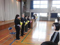 3月10日、交通安全協会から6年生にプレゼント(緊急用ホイッスルとミニライト)をいただきました。協会を代表して、いつも登下校を見守っていただいている地域の方3名にお越しいただきました。6年生代表の2名がプレゼントを受け取りました。
