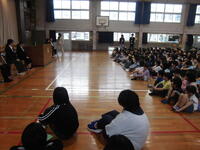 2月19日、4~6年生は、宮崎県防災士ネットワーク延岡支部の皆さんの協力をいただき、「防災教室」を開催しました。6年生は、避難所で自分たちにできることを発表したり、簡易トイレの説明を聞いたりしました。5年生はけがをしたときの応急処置などについて、4年生は簡易担架づくりを体験しました。