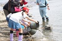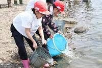 4月9日、4年生は、延岡五ヶ瀬川漁協、延岡市水産課、延岡観光協会の協力をいただき、アユの稚魚を放流しました。総合的な学習の時間の大瀬川に関する学習の一環として取り組みました。