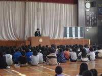 4月23日、梅田学園自動車学校の協力をいただき、交通安全教室を体育館で開催しました。自転車の安全な乗り方、安全な歩行などについて説明していただきました。低学年の子どもたちは、横断歩道を安全に渡る練習もしました。