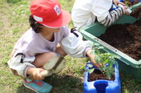 5月9日。1年生は、生活科の学習でアサガオの種をまきました。何色の花が咲くか楽しみにしていました。