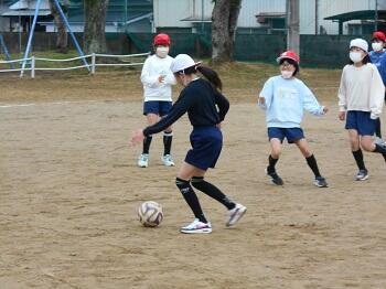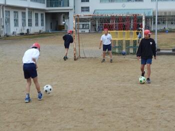 今、5年生の体育ではサッカーをしています。ボールを追いかけることに夢中になりすぎると、大勢がボールに集まってきます。そうならないように、みんなで作戦を立てて、お互い声をかけるように工夫をしていました。