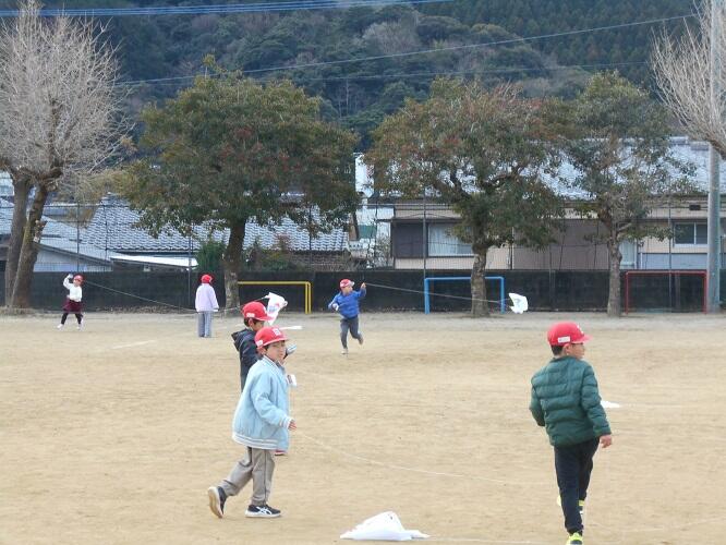 1年生が校庭でたこ揚げをしていました。自分の作ったたこを背に、運動場を駆け回る1年生の姿がとてもかわいかったです。