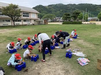 1年生が新しい植木鉢にあさがおの種をまいていました。