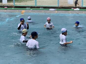 子どもたちは「重いよ~」「体がうまく動きませ~ん」といいながら、服を着たままの遊泳の難しさを体験していました。