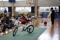 4月23日、梅田学園自動車学校の協力をいただき、交通安全教室を体育館で開催しました。自転車の安全な乗り方、安全な歩行などについて説明していただきました。低学年の子どもたちは、横断歩道を安全に渡る練習もしました。