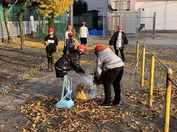 朝登校するやいなや、子どもたちがほうきやちりとり、ごみ袋を持ってきて、落ち葉集めをしています。自分たちで何かできないかという話合いのもと、朝の時間に落ち葉集めをすることになったようです。