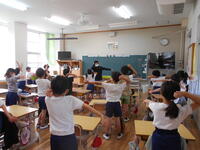 本校では、体づくりの一環として、音楽に合わせて簡単な体操をしています。4月19日は、1年生のために体育委員会の子どもたちが手本を示しました。1年生は楽しそうに取り組んでいました。