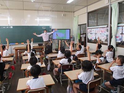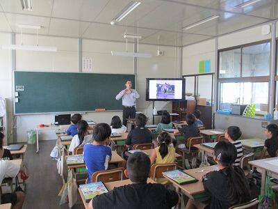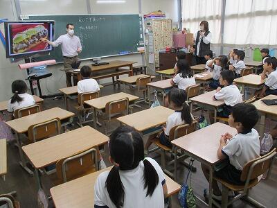 アメリカのことを教えてもらったり、英語の発音を聞いてまねしたりと外国語に触れるよい機会となりました。子どもたちはとても楽しそうな雰囲気で学習していました。