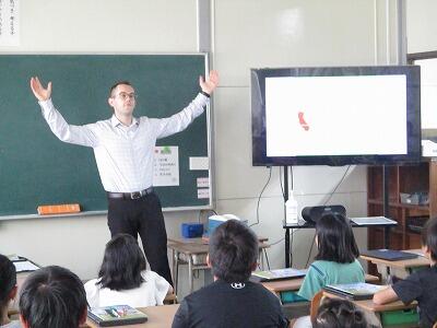 2学期から水曜日と金曜日、月曜日と木曜日の午前中にALTのサミュエル・ヤングス先生が来られています。サム先生は、アメリカのカリフォルニア州(ロサンゼルス)出身で、小・中・高校と野球をされていたそうです。8月に来日してまだ1ヶ月くらいですが、日に日に日本語を覚え、上達していっています。