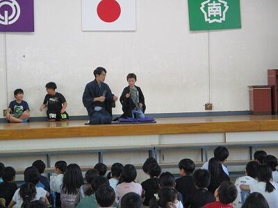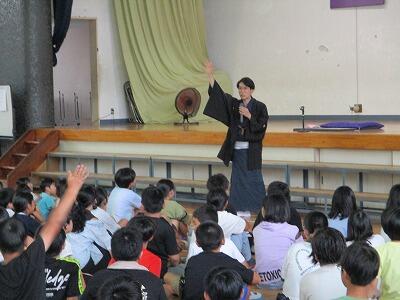 とてもユニークな噺(はなし)や、扇子と手ぬぐいを使った仕草に子どもたちは魅了されていました。会の途中では、4名の児童が高座に上がり、扇子を使った刀を抜く動作を体験することができました。