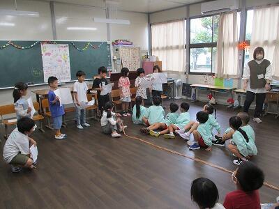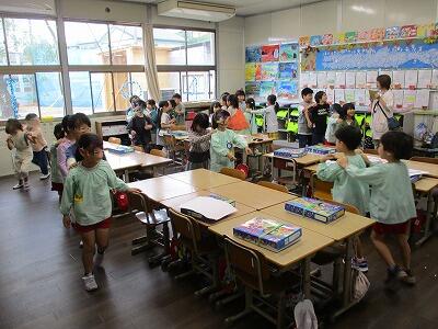 来年入学する園児に学校の勉強や給食、そうじなどについて説明をしたり、クイズやお絵かき、じゃんけん列車をしたりして楽しく交流しました。お兄ちゃん、お姉ちゃんの顔つきで小学校の紹介をしていた1年生の成長が見てとれました。