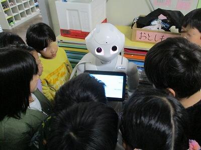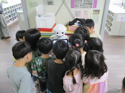 1学期に興電舎様より贈呈していただいた人型ロボット「ペッパーくん」は、10月後半から仮設校舎の1階部分にいます。