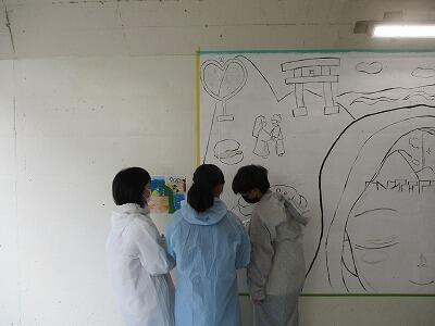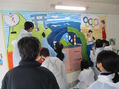 南小からも3名の児童が参加し、延岡や今年1年を象徴する壁画を完成させました。