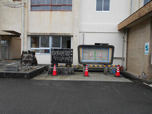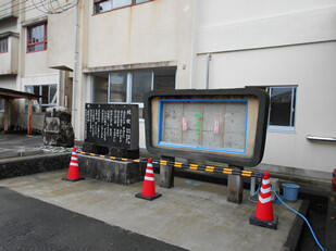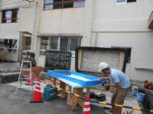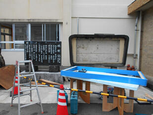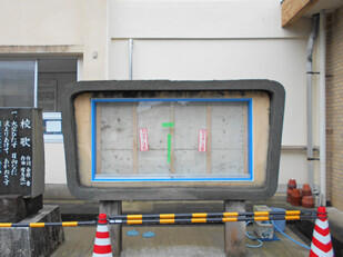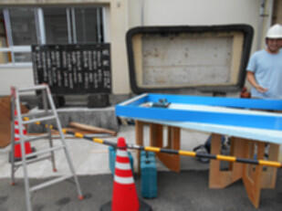 中の木枠がかなり年数が経って痛んでいるいるので、業者の人による修繕が進んでいます。まだ、完成ではありませんが、学校による機会があれば、きれいになった掲示板をご覧ください。