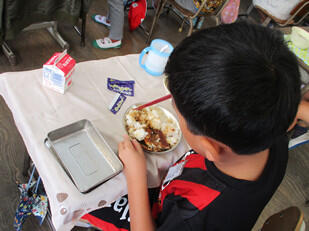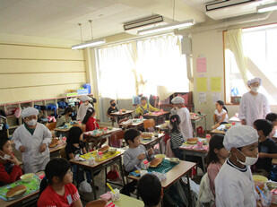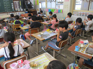 2年生は、今週から給食当番をしています。5年生・4年生の数名の応援をもらいながら、おかずをついだり、パンや牛乳を配ったり、上手にできています。