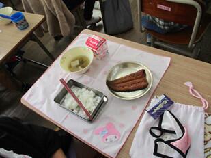 甘辛いたれとご飯がぴったりで、ウナギも格別おいしかったです。子どもたちも大満足の給食でした。