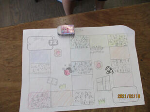 今日は、完成して実際にお友達とたのしくすごろく遊びをしました。枠に書いてあることなどを質問して、相手のことを知ったり、自分のことをうまく相手に伝えることも目的としています。