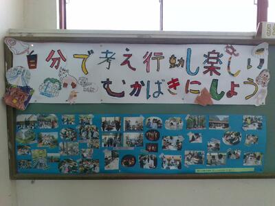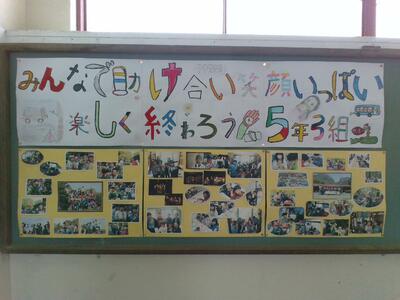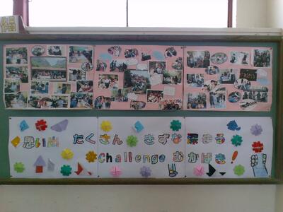 5年生が5月に行ってきたむかばき宿泊学習。各クラスで活動の振り返りが写真を使ってまとめられていました。