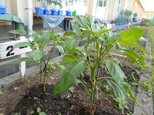気温も徐々に高くなり始めていますが、2年生が生活科で花壇に植えている野菜たちもすくすく成長しています。