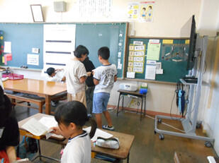 4学級のそれぞれの班が混じって、3つの教室で発表しました。知らない教室で知らないお友達に発表するので少し緊張している子どももいました。