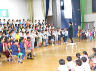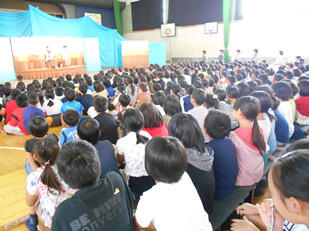 740名が体育館に集まると壮観です。みんなしっかりと友だちの発表や先生の話を聞くことができました。