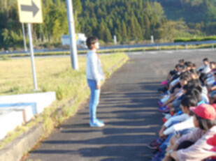 3連休明けの16日(火)の早朝に、延岡警察署と市役所の方が来校され、南小の交通少年団の人と一緒に「交通安全の呼びかけ」と「朝のあいさつ運動」をしてくれました。