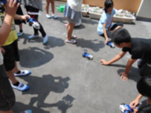 3年生が、太陽電池を使って模型の車を動かす実験をしていました。走っているけど、柱の陰に入ると止まるので理由を考えたり、後ろ向きに進むので配線を変えたり、いろいろなことに気がついていました。