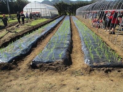 マルチに穴を開け、一本一本ていねいに植えていきました。全員で約1100本を植えました。子どもたちは初めて自分の手で玉ねぎを植えることができて大変喜んでいました。2月末の収穫がとても楽しみです。
